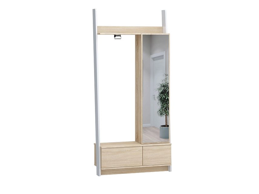 Комплектация: боковые наклонные стенки МДФ 19 мм в пленке ПВХ (односторонняя облицовка панели пленкой ПВХ), направляющие на ящиках шариковые 100% выдвижения без доводчиков, механизм открывания ящиков Push to open, петли без доводчиков, зеркало 4 мм (серебро, евро кромка по периметру)